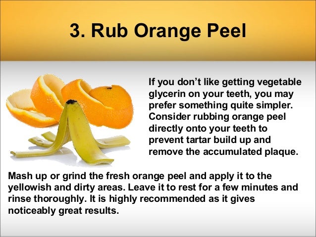 Tartar will cause cavities, gingivitis (gum infection) and tooth decay. Now, brush your teeth using the leftover particles. To brush the teeth effectively, a person can: Other serious health complications, such as periodontitis, can also arise from tarter buildup. The buildup of bacteria (plaque) on your teeth and gums is both unhygienic and bad for your overall health. Coconut oil contains antioxidant properties, thereby making it safe for teeth. Simply shake a small amount of baking soda into a bowl, wet your toothbrush, then dip the bristles into the baking soda to coat. Lemon juice also works great for removing all the bad microbes from the teeth. The vitamins and minerals from the peel blasts the plaque from your teeth without exposing your teeth to the acids of the actual fruit. One more popular home remedy for removing plaque from teeth, which uses baking soda, involves mixing one teaspoon of baking soda with enough hydrogen peroxide to make a paste. Chew spicy foods to remove plaque and tartar spicy foods helps to clean your teeth and mouth naturally. As a result, harmful bacteria get killed, besides whitening your teeth. Just rub the orange peel over your teeth and leave it for some time.